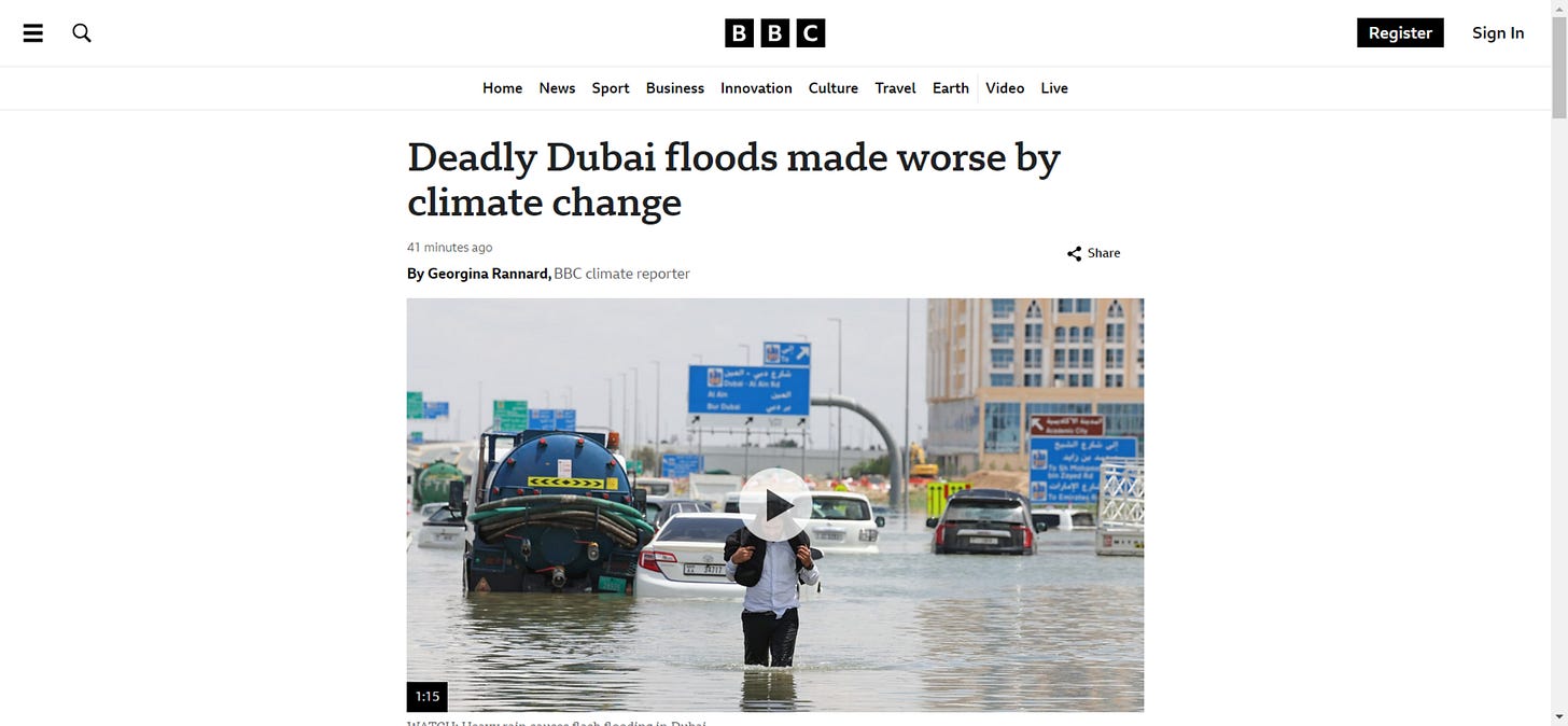 Guess what? The ‘study’ proves nothing because of the poor quality and limitations of the observational data but moreover because the climate models failed to agree with the limited observational data! They found nothing, zilch, nada, SFA, but for propaganda purposes they still published their shoddy ‘research’ and have got the complicit BBC and other MSM outlets to spin the narrative that it was climate change which contributed to the Dubai floods (and not cloud-seeding). El Nino (natural weather) is awarded an honorary supporting role.