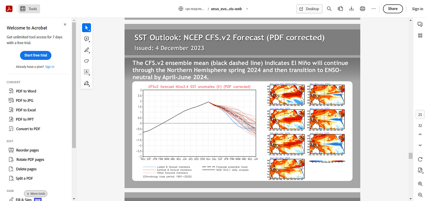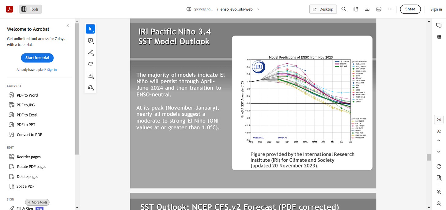 The 2023 El Nino is a minnow by comparison (currently peaking at 1.8C), rating officially only as ‘moderate/strong’, which is predicted to max out very soon and wind down thereafter.