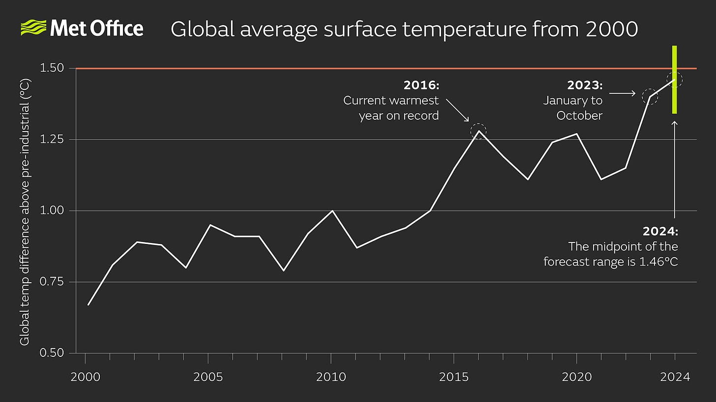 The average global temperature for 2024 is forecast to be between 1.34 °C and 1.58 °C (with a central estimate of 1.46 °C) above the average for the pre-industrial period (1850-1900): the 11th year in succession that temperatures will have reached at least 1.0 °C above pre-industrial levels.